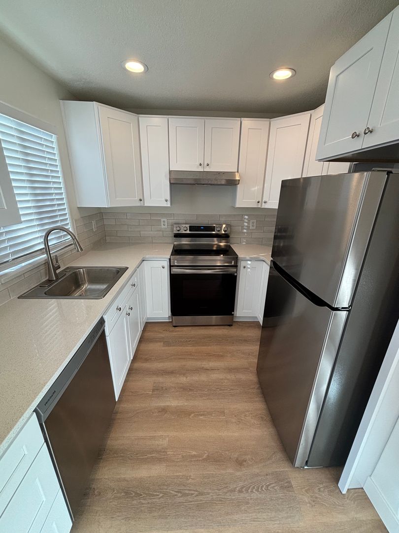 • Updated kitchen with new cabinets, quartz countertops & stainless steel appliances